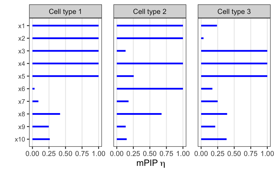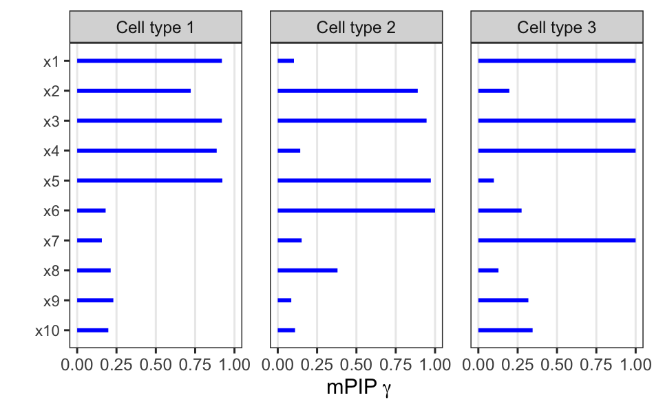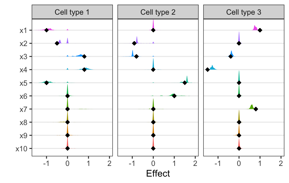 The following figure shows the posterior distributions of cell-type-specific effects associated with cell-type-specific progression with the black diamonds indicating true effects, and marginal posterior inclusion probabilities (mPIP) of Bayesian variable selection (BVS).