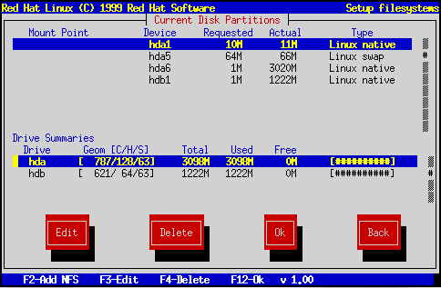 El siguiente cuadro de diálogo contiene una lista de todas las particiones de disco accesibles por Red Hat Linux, incluyendo particiones para MS-DOS o Windows. Esto le proporciona la oportunidad de asignar estas particiones a diferentes partes de su sistema de ficheros Red Hat Linux. Las particiones que asigna se montarán automáticamente cuando arranque su sistema Red Hat Linux. Seleccione la partición que quiere asignar y pulse Enter (o elija Edit); entonces introduzca el punto de montaje para esa partición, v.g., /usr (véase la figura fig:inst-fs-other-net).