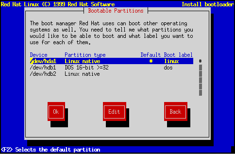 También hay una columna etiquetada ``Por defecto.'' Solo una partición contendrá un asterisco sobre esta columna. La partición marcada por defecto será la partición que LILO arrancará si no hay una entrada del usuario en el proceso de arranque. Inicialmente la partición raíz para la instalación de Red Hat Linux es la seleccionada por defecto. Si quisiera cambiar esta, utilice la teclas de movimiento del cursor para sobre-iluminar la partición que desea que arranque por defecto, y pulse F2. El asterisco se desplazará a la partición seleccionada. Cuando termine, seleccione Ok, y pulse Espacio.