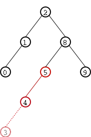 Veamos un ejemplo concreto. Deseamos insertar el número 3 en el árbol de enteros de Figure 5. La inserción se muestra punteada en Figure 6. Sin embargo, como puede verse, la inserción a provocado la pérdida de la propiedad de equilibrio del árbol ya que dicha propiedad no se cumple en el nodo marcado con rojo. ¿Qué hacemos para recomponer dicha pripiedad? Simplemente realizamos una rotación simple. En este caso se dice que la rotación es izquierda ya que la "pérdida de equilibrio se produce hacia la izquierda. En Figure 7 puede verse el árbol luego de la rotación: la propiedad de equilibrio ha sido reestablecida. Como mostramos atrás, la rotación conserva el orden entre los nodos, por lo que podemos afirmar que este último árbol si es AVL.