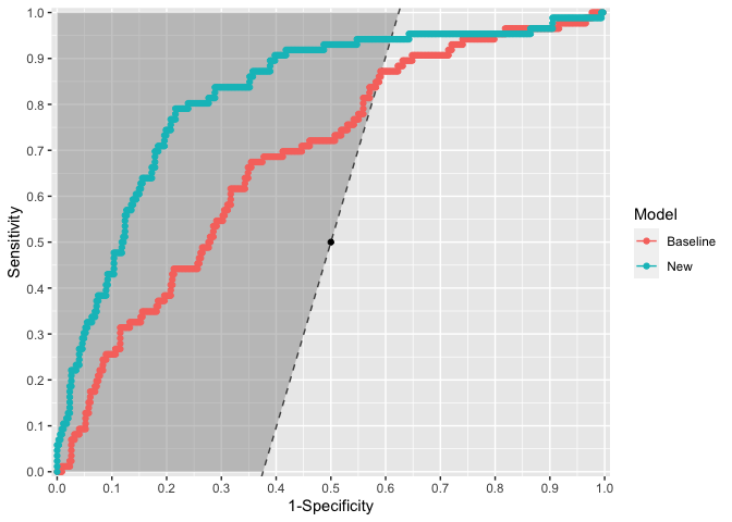 ggroc(x1 = baseline_risk, x2 = new_risk, y = outcome, carrington_line = TRUE)