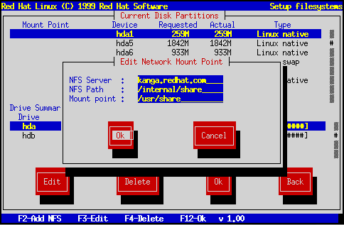 Red Hat Linux también le permite montar volúmenes NFS de sólo-lectura cuando su sistema arranca; esto permite la compartición de árboles de directorios por una red. Para hacerlo, presione F2. Si no ha seleccionado un método de instalación por red, se le mostrarán varios cuadros de diálogo relativos a la configuración de la red (remítase a la sección sub:configuring-tcpip-networking para mayor información). Rellénelos adecuadamente. Entonces verá un cuadro de diálogo titulado ``Editar Puntos de Montaje de la Red'' [``Edit Network Mount Point'']. Introduzca el nombre del servidor de NFS, el camino al volumen NFS, y el punto de montaje local para ese volumen (vea la figura fig:inst-fs-nfs).