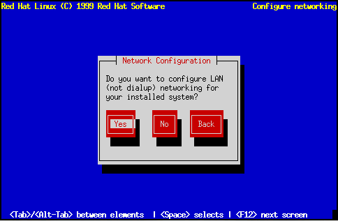 A continuación, el programa de instalación le ofrece la oportunidad de configurar (o reconfigurar) su red. Si está instalando desde CD-ROM o desde un disco duro local, el programa de instalación le pregunta si desea configurar la red. Si usted elige No, su sistema Red Hat Linux será una estación de trabajo independiente. Si elige Si, usted podrá configurar su red como se describe a continuación.