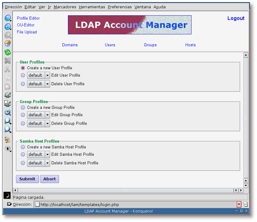 Como se ha comentado anteriormente, se va a emplear la herramienta LDAP Account Manager para la gestión de usuarios. Las capturas de pantalla que se muestran a continuación mostrarán los pasos que hay que seguir para añadir un usuario al sistema: