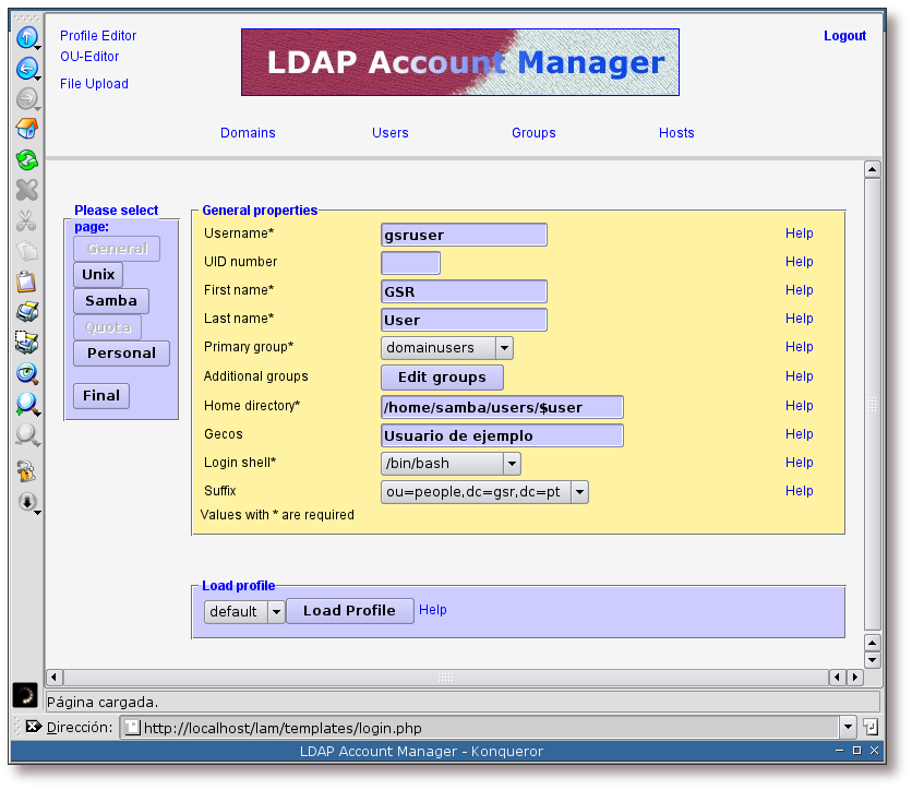 Antes de comenzar a completar los campos con los datos del nuevo usuario, se ha de seleccionar el perfil anteriormente creado, GSR. Una vez seleccionado, se pulsa sobre el botón: Load Profile.