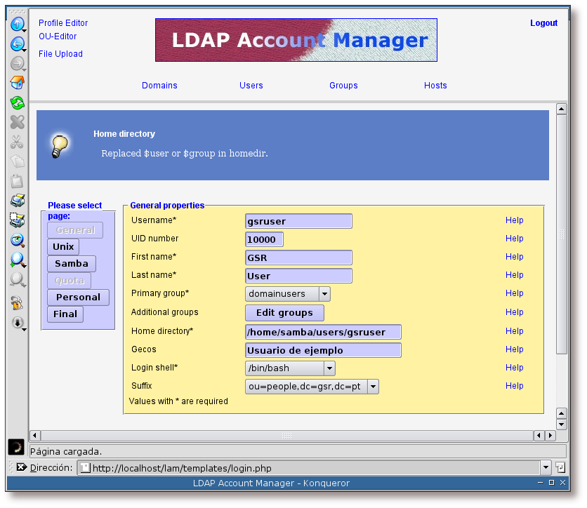 Home Directory: localización del home de los usuarios. La ruta donde se establecerán los archivos personales de cada usuario será: /home/samba/users/$user/, donde la variable $user se sustituirá por el nombre del usuario a la hora de su creación.