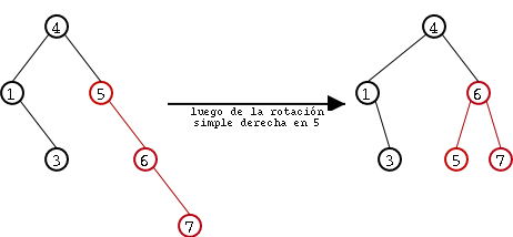 Como podemos observar, el resultado luego de la rotación es un árbol AVL: posee tanto el órden correcto de un árbol de búsqueda entre sus nodos y la propiedad de equilibrio. En este caso el "desequilibrio" en el árbol con raíz 5 era enteramente hacia la izquierda y por lo tanto, como ya dijimos, la rotación efectuada se denomina rotación simple izquierda. En el caso de un "desequilibrio" hacia la derecha, la rotación es análoga y se denomina rotación simple derecha. En Figure 8 se ven dos árboles: el primero tiene un "desequilibrio hacia la derecha" marcado en rojo y el segundo es el resultado de aplicar una rotación simple derecha.